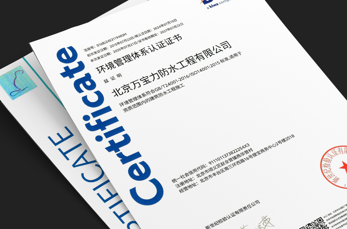 WANBAOLI serves as the Vice President Unit of Beijing Construction Engineering Materials Association, Director Unit of China Building Waterproof Association, Practice Education Base of Beijing University of Civil Engineering and Architecture, and Joint Training Base for Postgraduates of Beijing Jiaotong University. It has participated in the formulation of national standards and group standards for many times, and has obtained ISO9001 quality management system certification, ISO14001 environmental management system certification and ISO45001 occupational health and safety management system certification. The standard T/CBMF84-2020 "Polymer Modified Asphalt Water-based Spray Waterproof Coating" drafted by WANBAOLI was listed as the 2021 Group Standard Application Demonstration Project by the Ministry of Industry and Information Technology.